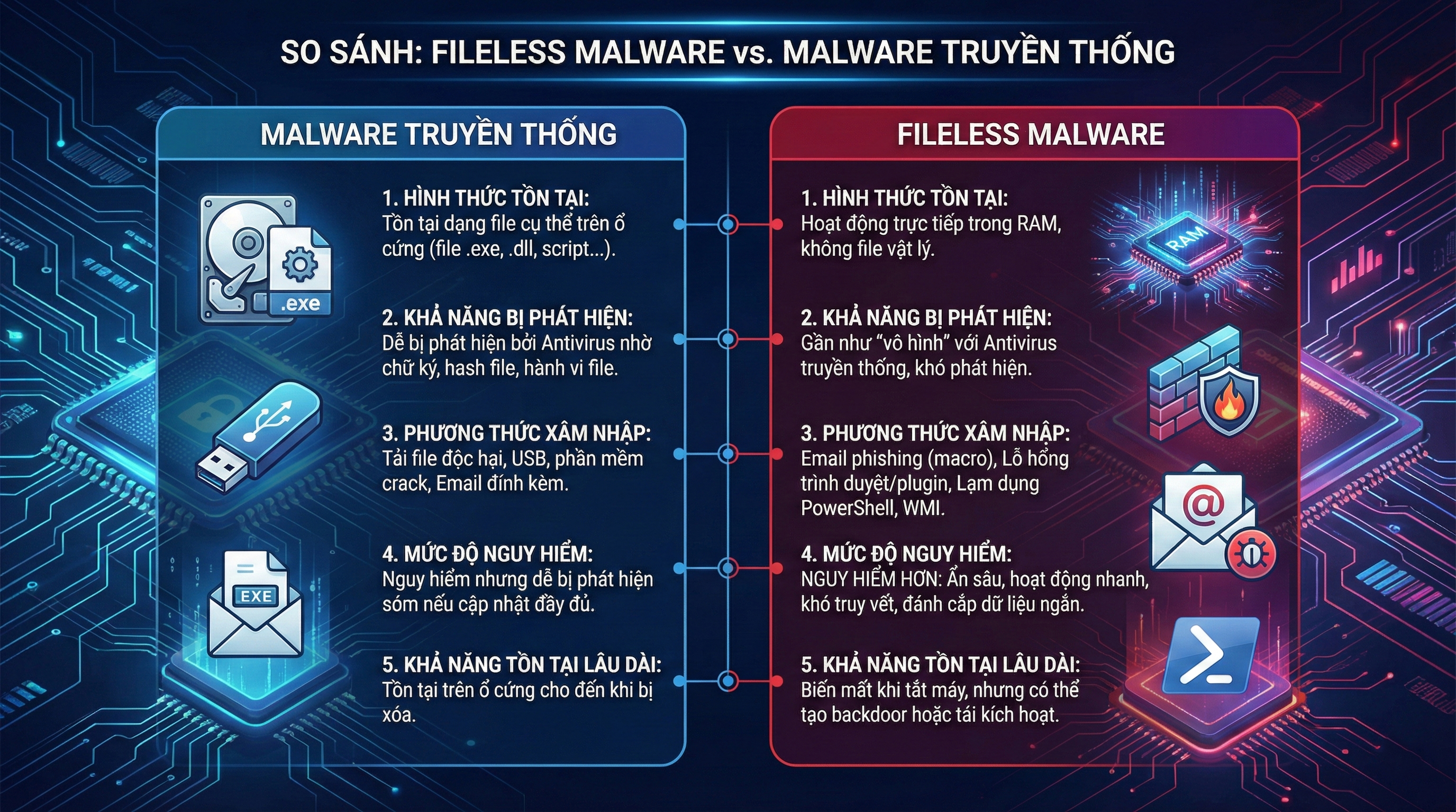 Đây là điểm khác biệt cốt lõi khiến Fileless Malware khó bị phát hiện hơn rất nhiều.