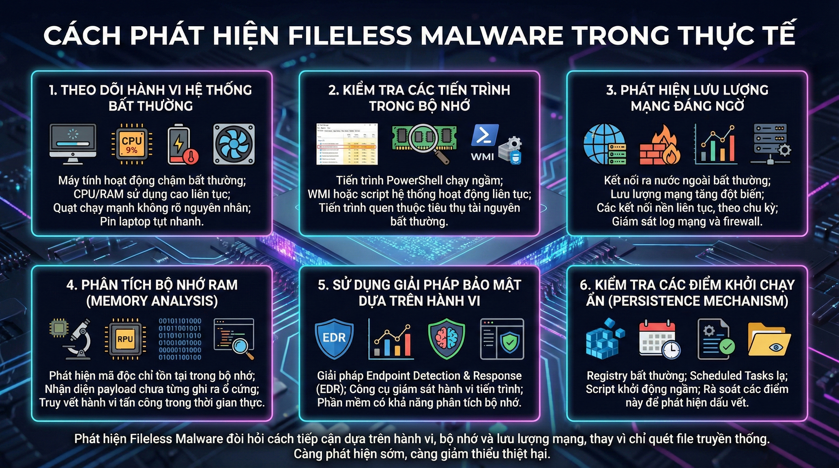 Việc phát hiện Fileless Malware khó hơn rất nhiều so với malware truyền thống do không tồn tại dưới dạng file và gần như không để lại dấu vết trên ổ cứng. Tuy nhiên, trong thực tế vẫn có những dấu hiệu và phương pháp giúp người dùng và quản trị hệ thống nhận biết nguy cơ bị nhiễm loại mã độc nguy hiểm này.