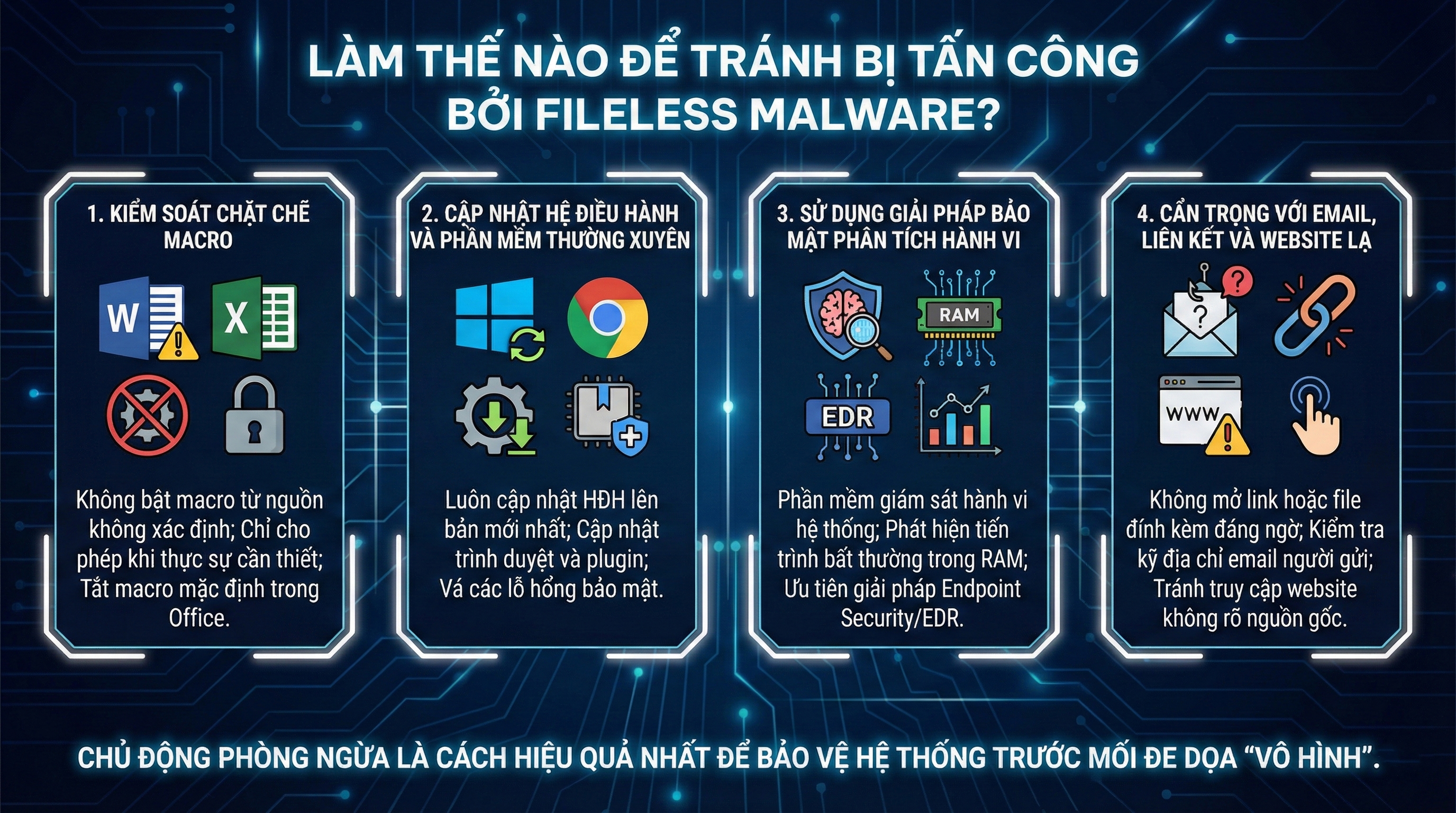 Phòng tránh Fileless Malware không phụ thuộc vào một biện pháp duy nhất mà cần kết hợp thói quen sử dụng an toàn, cập nhật phần mềm và giải pháp bảo mật phù hợp. Chủ động phòng ngừa luôn là cách hiệu quả nhất để bảo vệ dữ liệu và hệ thống trước những mối đe dọa “vô hình” này.
