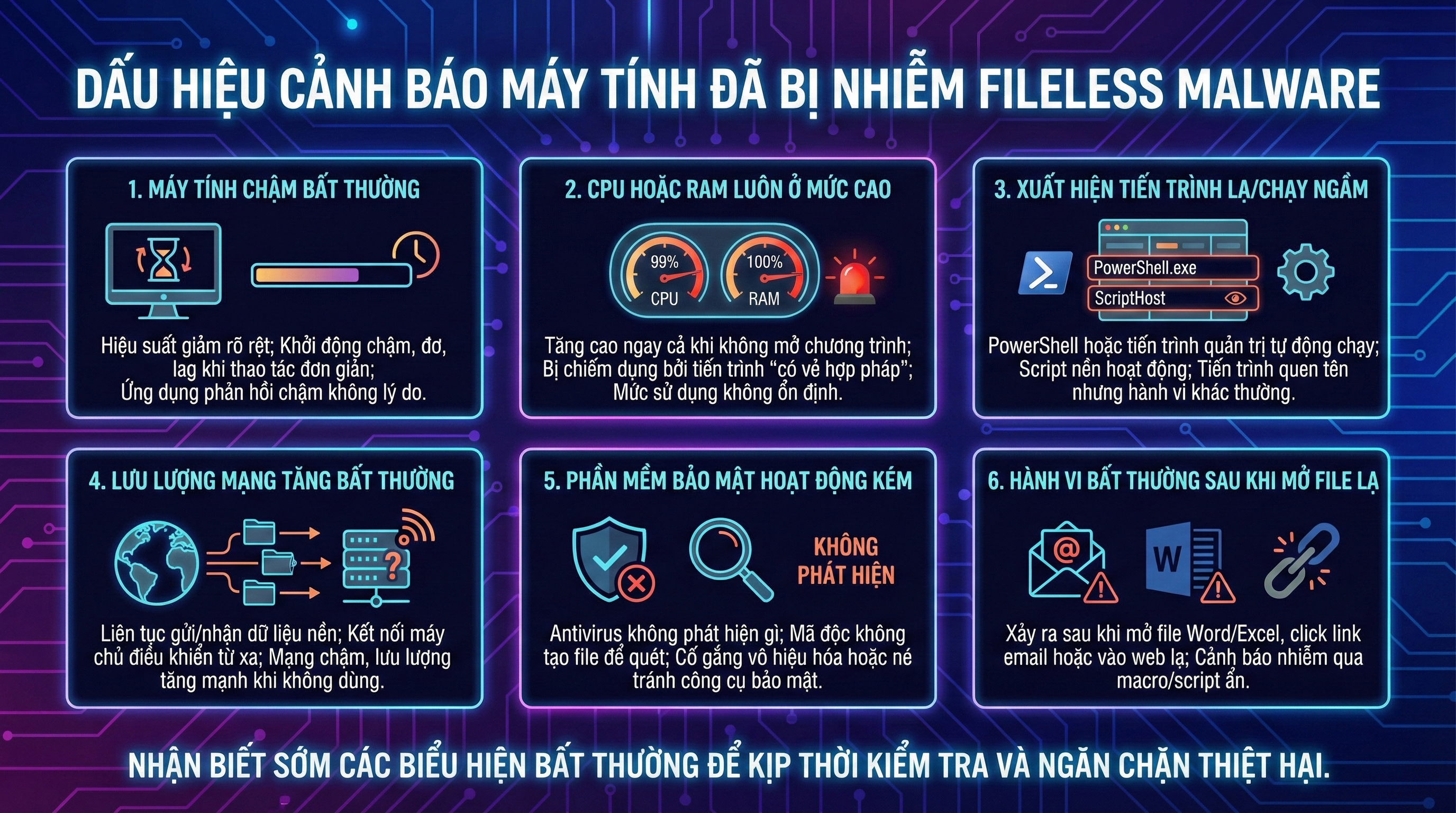 Do không để lại file trên ổ cứng, Fileless Malware thường không tạo ra cảnh báo rõ ràng như các loại virus truyền thống. Tuy nhiên, trong quá trình hoạt động, loại mã độc này vẫn để lộ những biểu hiện bất thường mà người dùng có thể nhận biết nếu chú ý kỹ.