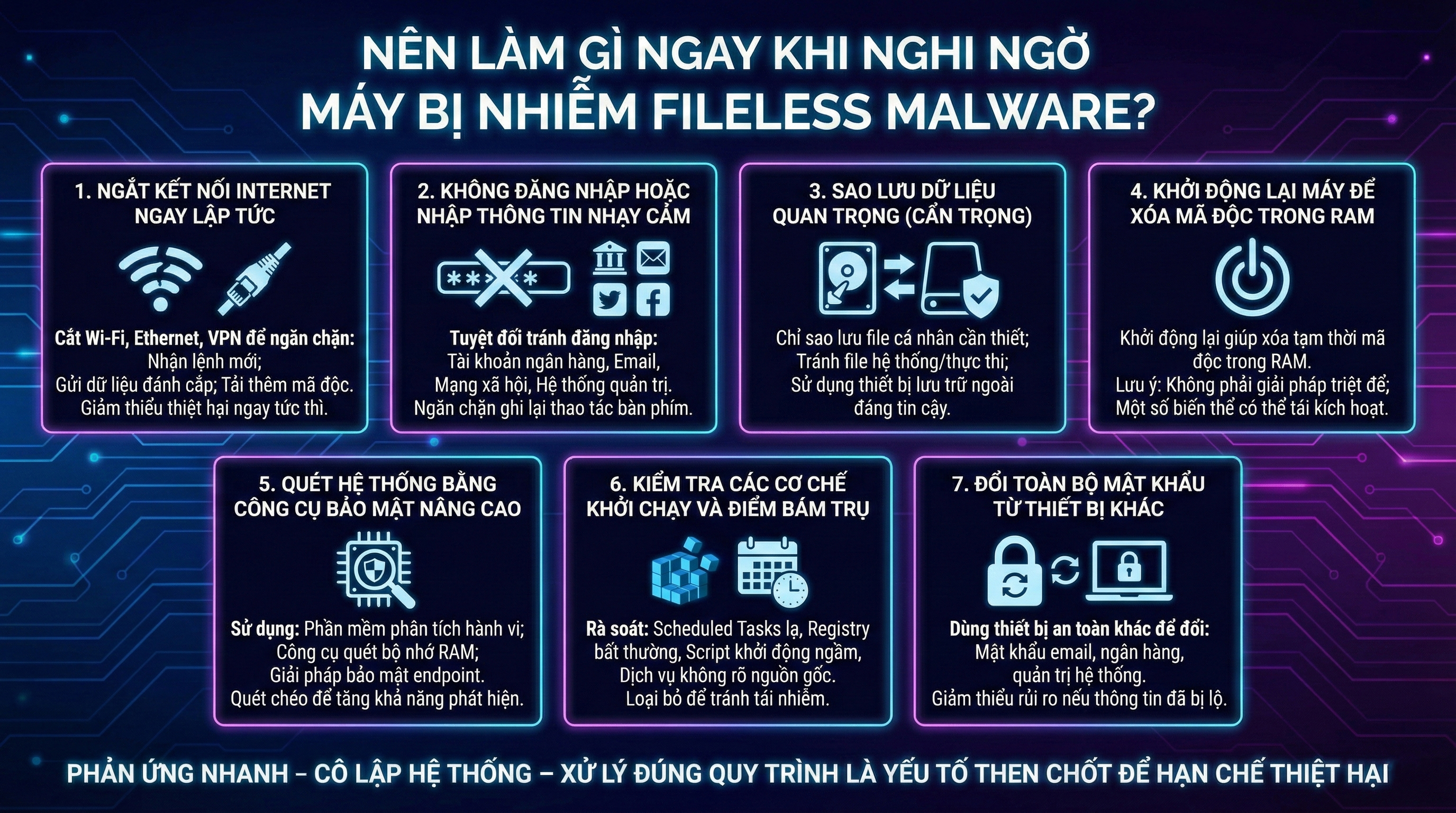 Khi xuất hiện các dấu hiệu bất thường cho thấy hệ thống có thể đã bị nhiễm Fileless Malware, điều quan trọng nhất là phản ứng nhanh và đúng cách. Do loại mã độc này hoạt động trong RAM và có thể hoàn tất mục tiêu chỉ trong thời gian rất ngắn, việc xử lý chậm trễ có thể dẫn đến mất dữ liệu hoặc bị kiểm soát hệ thống từ xa.