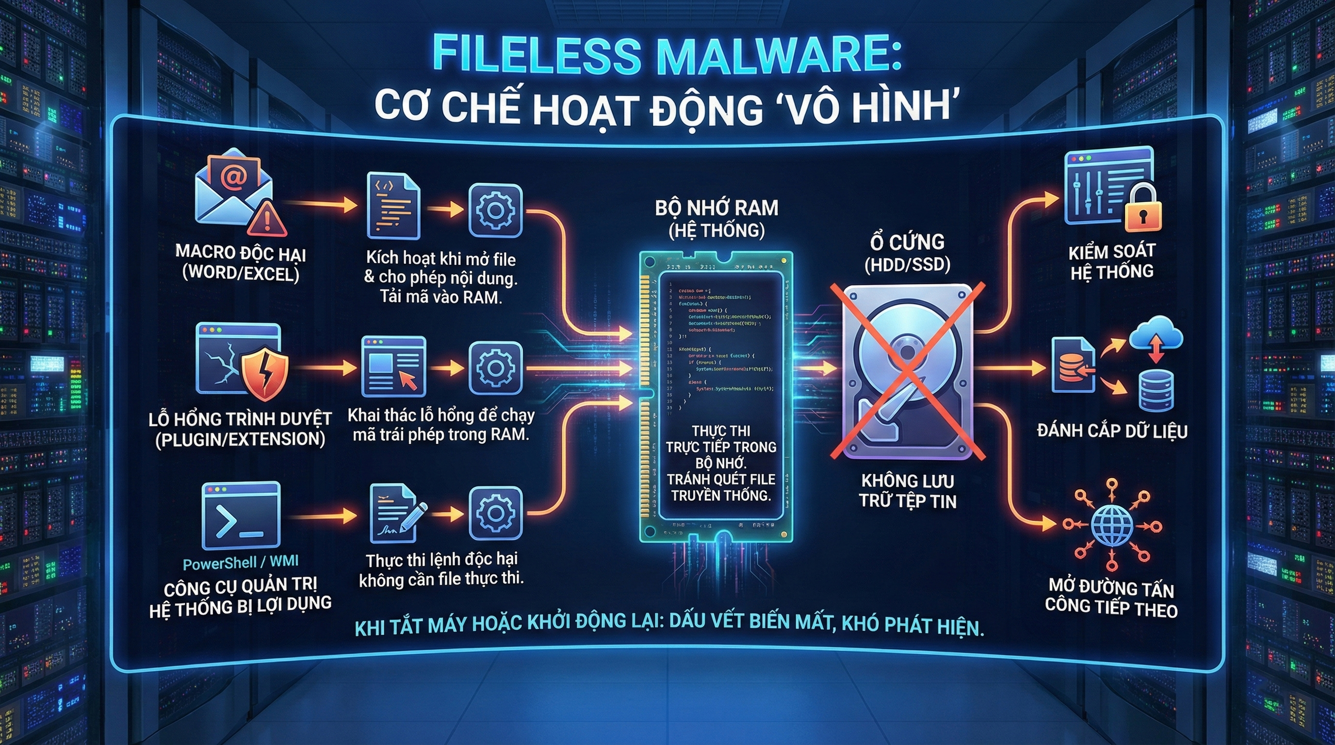 Thay vì cài đặt một chương trình độc hại hoàn chỉnh, Fileless Malware tận dụng những thành phần hợp pháp đã có sẵn trong hệ điều hành để thực hiện hành vi tấn công. Chúng thường xâm nhập thông qua các lỗ hổng bảo mật trong phần mềm phổ biến hoặc hành vi bất cẩn của người dùng, sau đó tải và chạy mã độc ngay trong bộ nhớ.