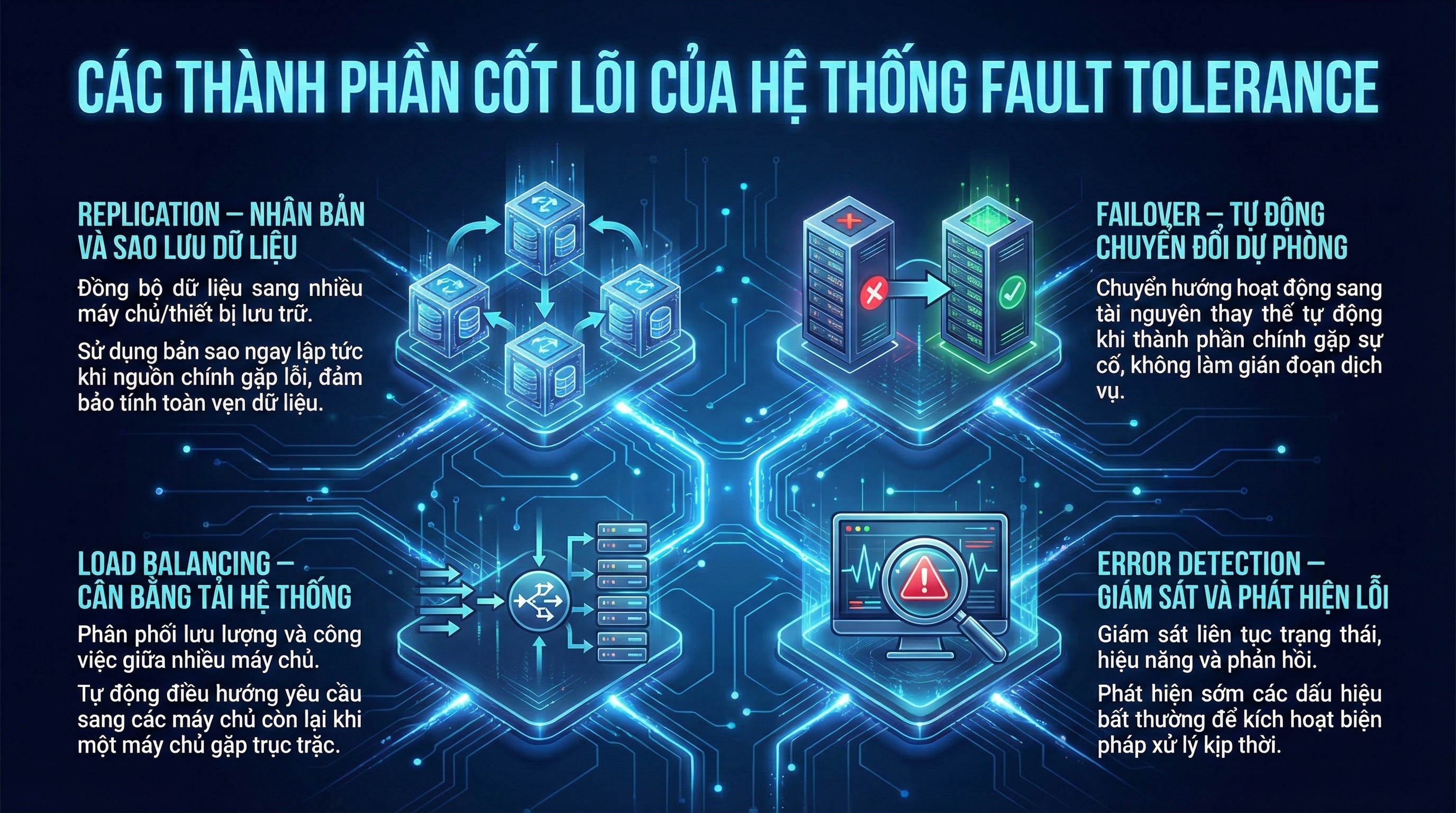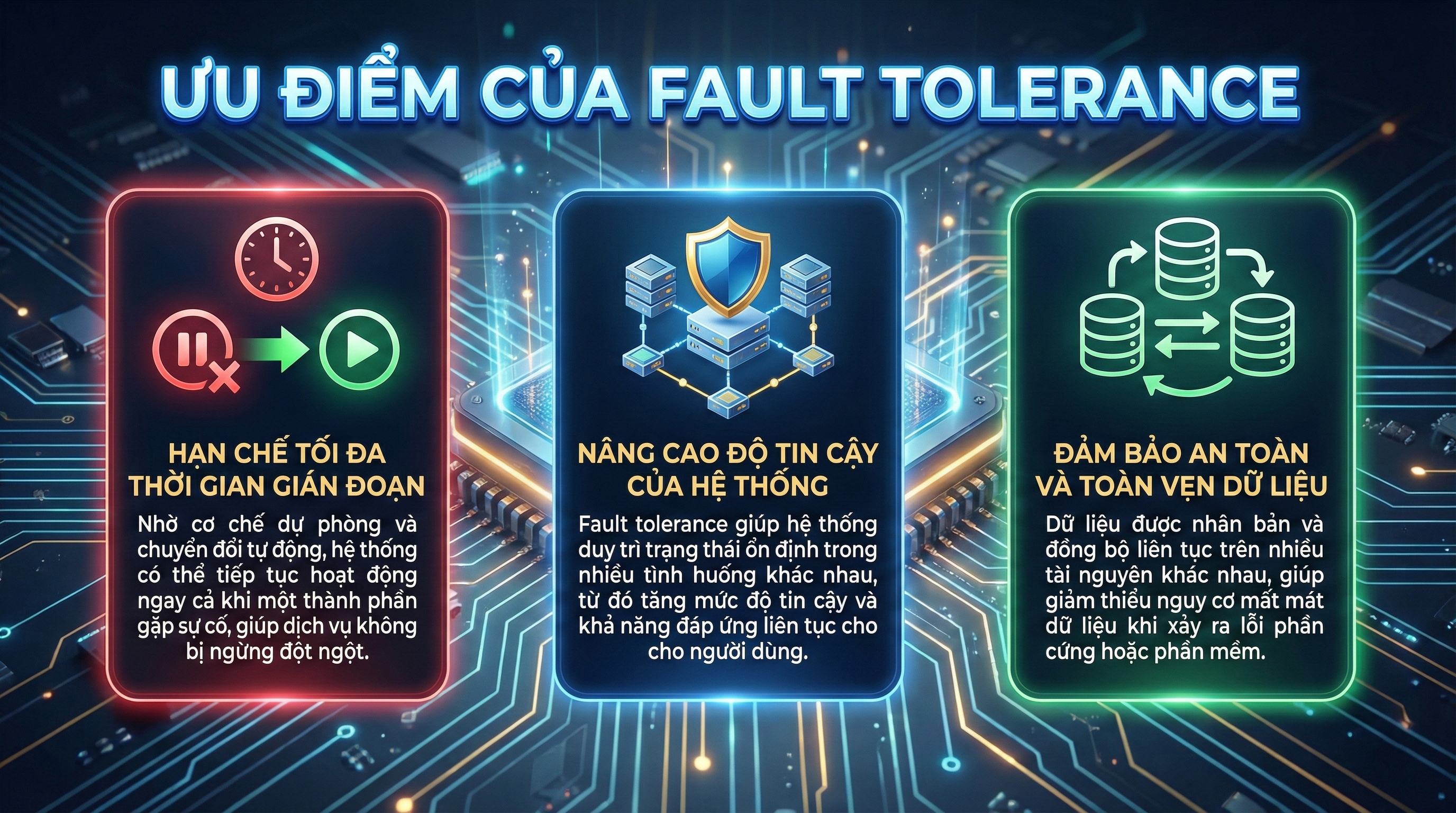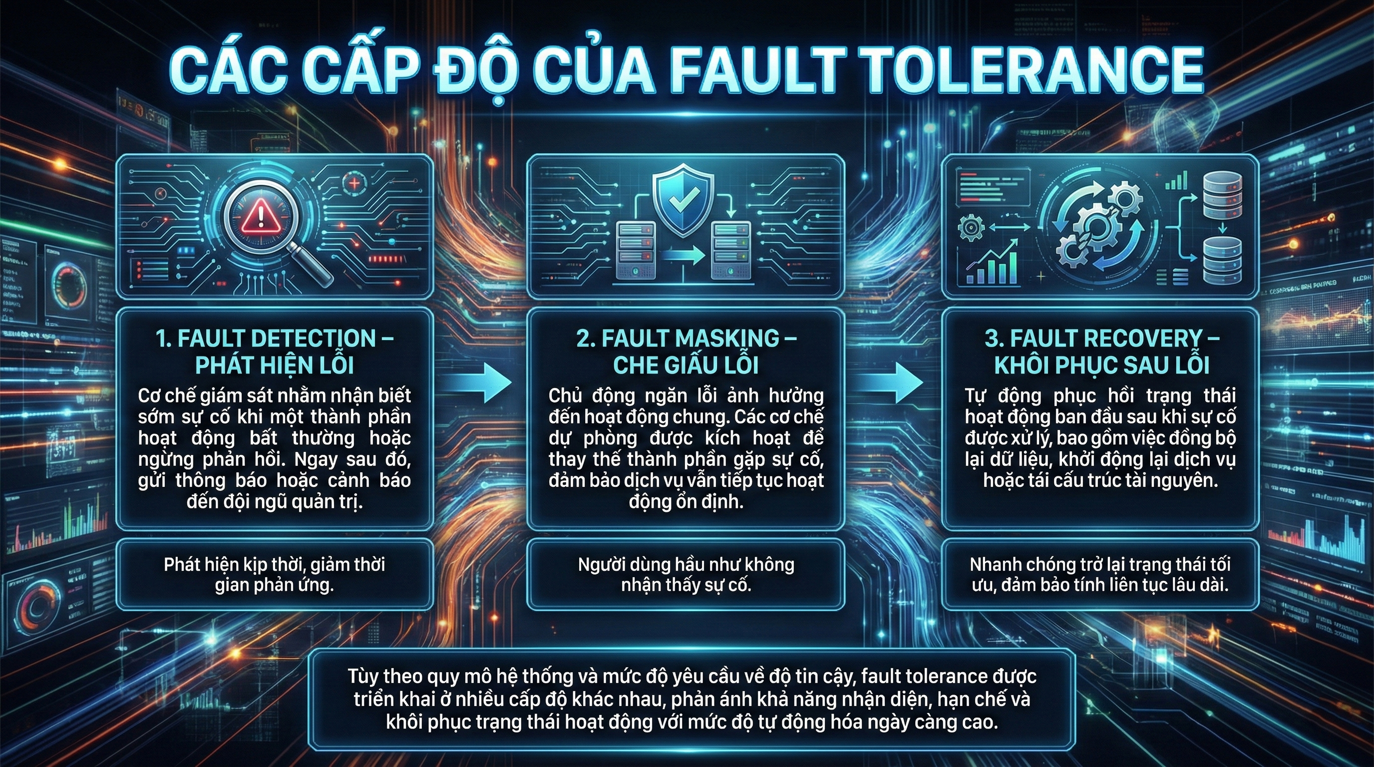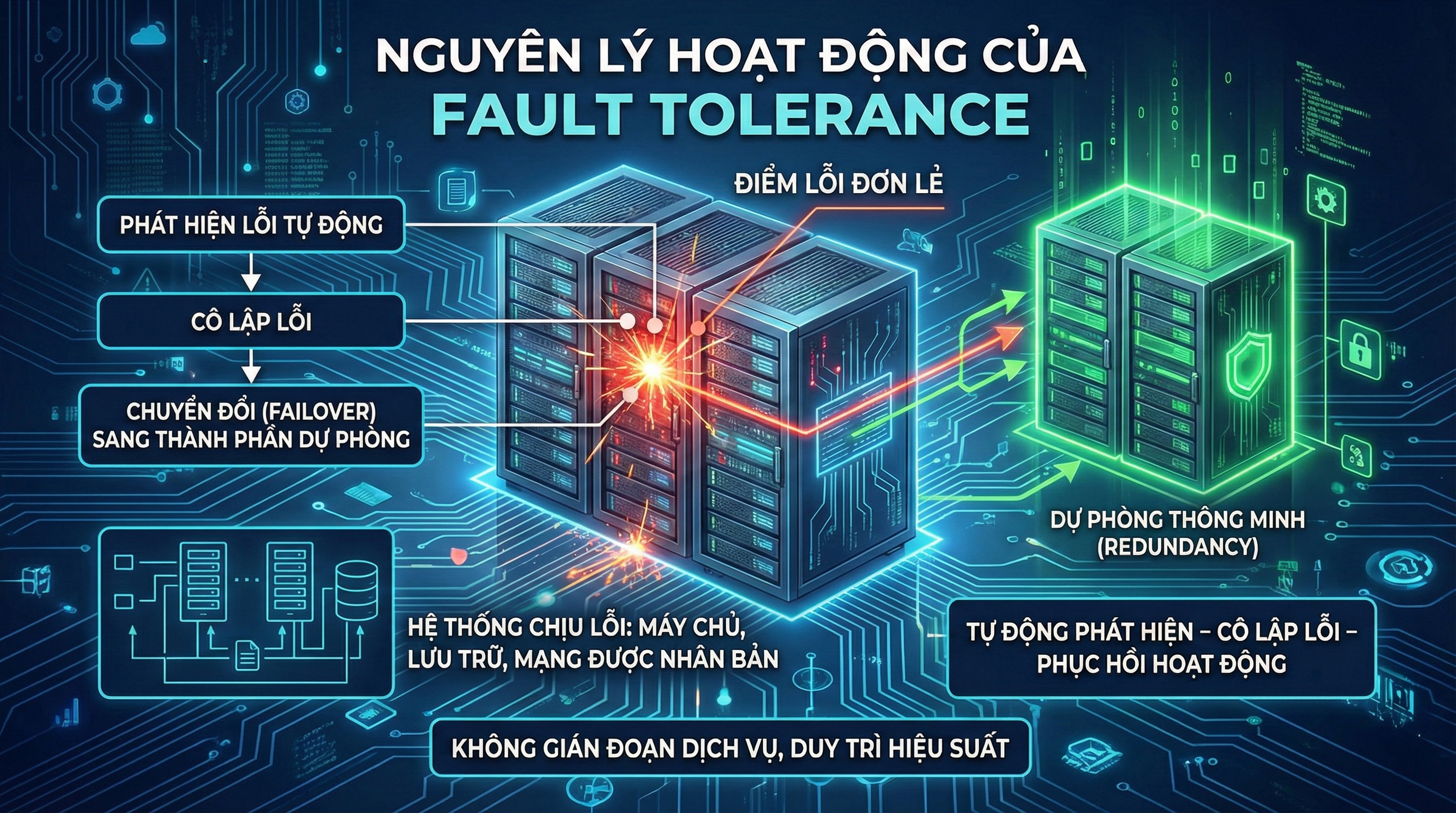 Điểm cốt lõi của fault tolerance nằm ở khả năng tự động phát hiện – cô lập lỗi – phục hồi hoạt động, hạn chế tối đa sự can thiệp thủ công từ con người. Nhờ đó, người dùng cuối gần như không nhận thấy sự cố xảy ra, trong khi hệ thống vẫn duy trì hiệu suất và tính ổn định cần thiết.