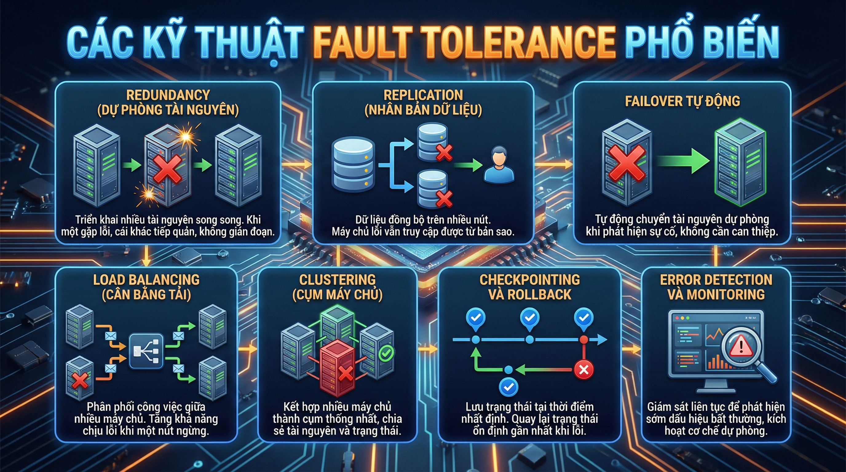 Để xây dựng một hệ thống có khả năng chịu lỗi hiệu quả, các kiến trúc sư hệ thống thường kết hợp nhiều kỹ thuật fault tolerance khác nhau. Mỗi kỹ thuật đóng vai trò riêng trong việc phát hiện, cô lập và xử lý sự cố nhằm đảm bảo hệ thống luôn duy trì trạng thái hoạt động ổn định.