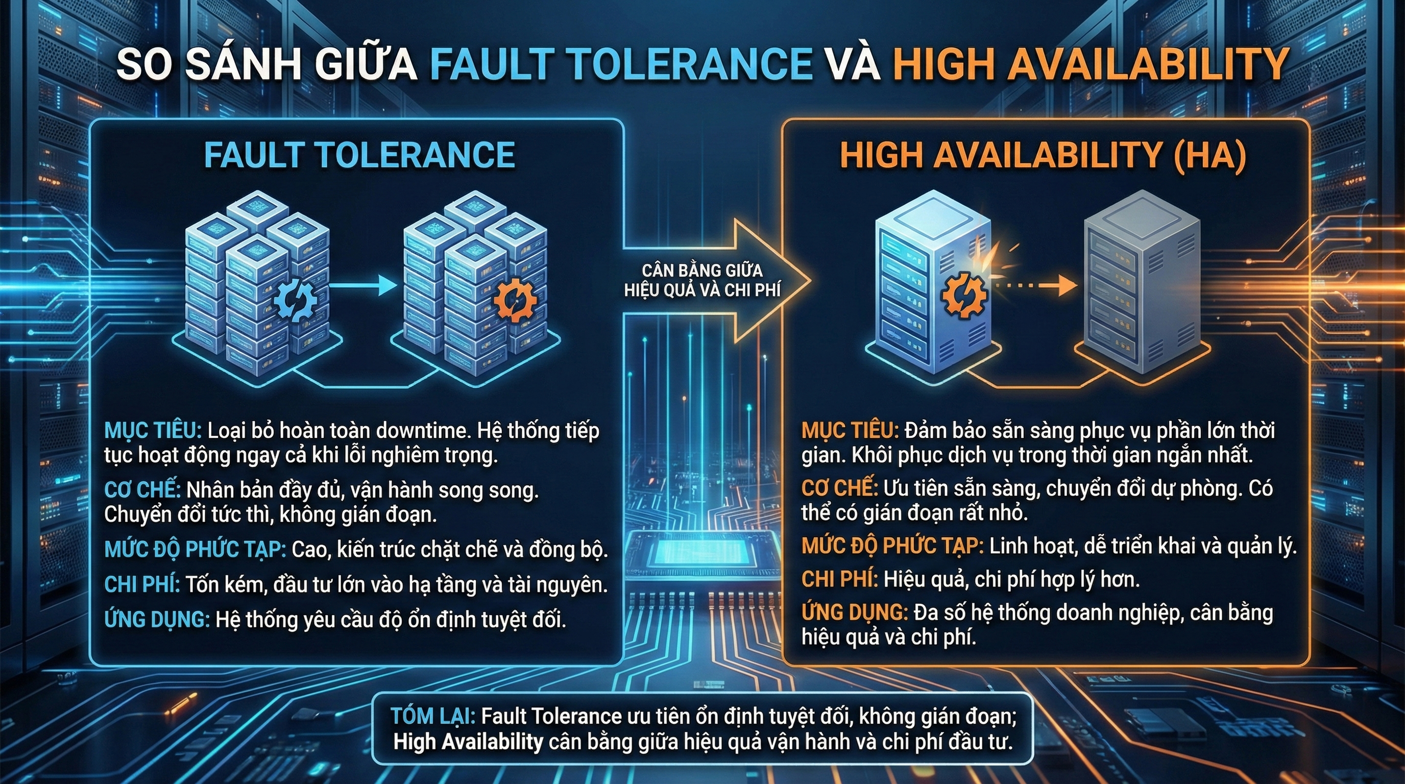 Tóm lại, fault tolerance phù hợp với những hệ thống yêu cầu độ ổn định tuyệt đối và không cho phép gián đoạn, còn high availability là lựa chọn cân bằng giữa hiệu quả vận hành và chi phí, phù hợp với đa số hệ thống doanh nghiệp hiện nay.
