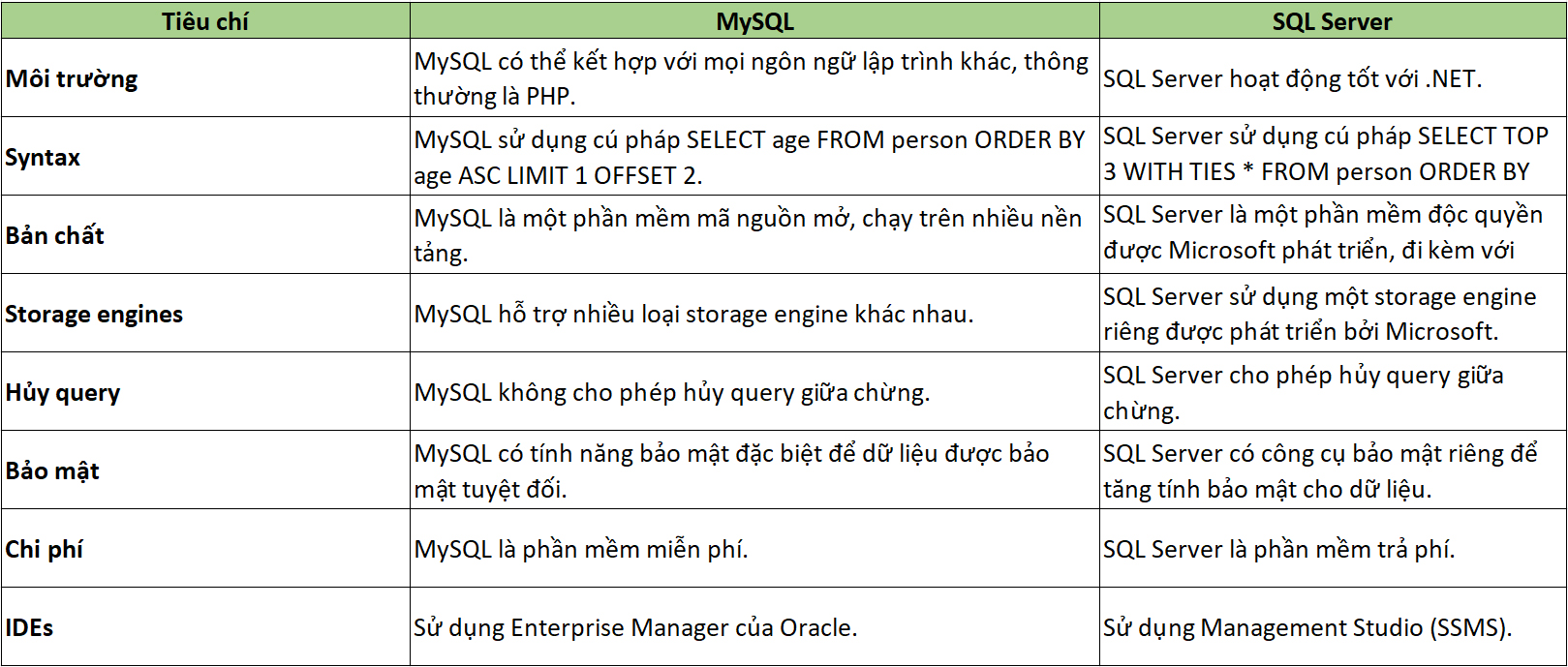 Bảng so sánh khác nhau giữa MySQL và SQL Server