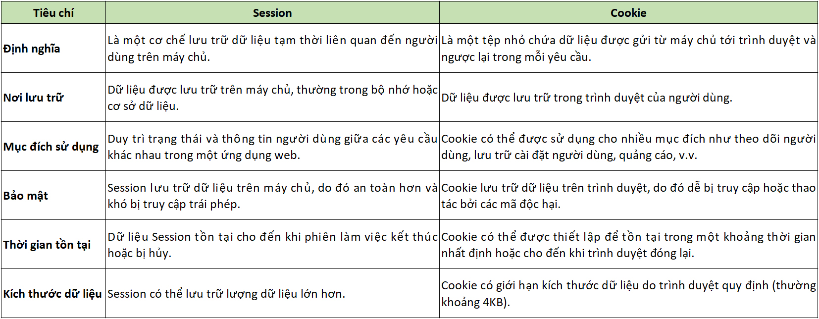 Session và Cookie có nhiều điểm khác biệt quan trọng cần lưu ý. Dưới đây là một bảng so sánh chi tiết giữa Session và Cookie: